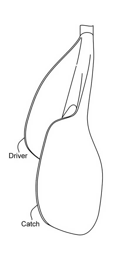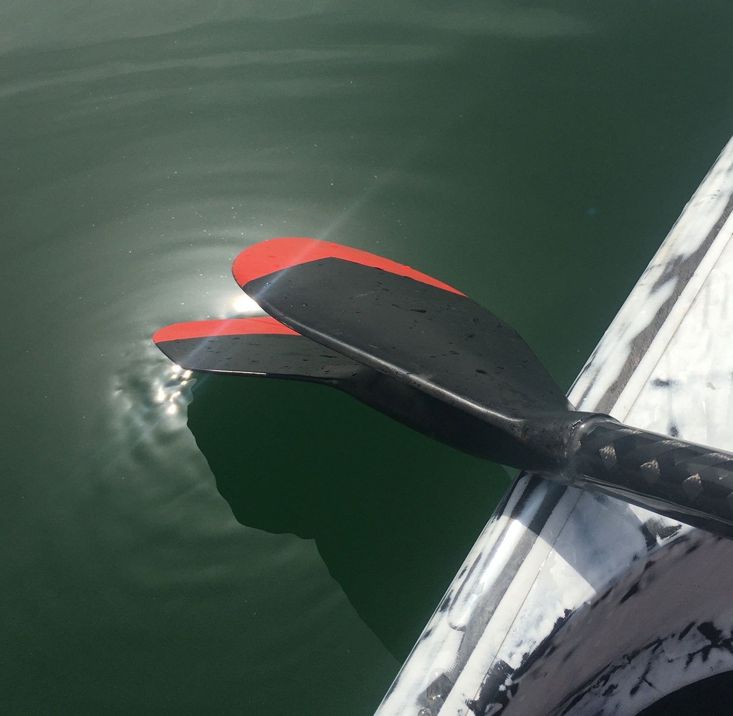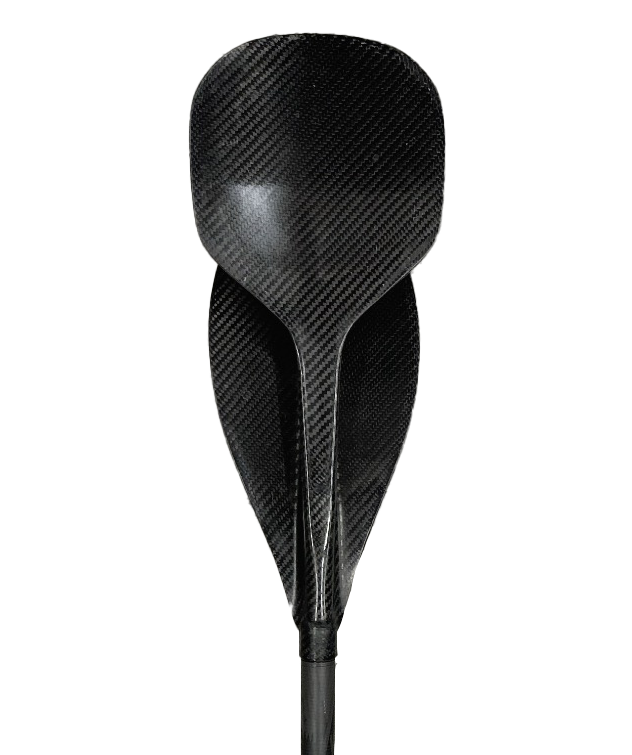 The majority of paddlers, even professionals, already allow their paddles to linger behind their efficiency zone, and may not reach out optimally for the catch. The TwinBlade utilizes this natural tendency to provide a more comfortable efficient experience, especially in windy conditions. Looking at the TwinBlade it appears to look like a lot of paddle with the two blades, but it’s just an average paddle blade divided horizontally. The catch blade is approximately 45 in.² with an angle of 10°. The driver blade, enters the water slightly later, has angled at 16° with an approximate surface area of 49.5 inches. The wedge connection between the blades attached to the shaft is streamlined for a water entry and release. The catch & driver blades are concave giving extra ability to hold water. There have been a few versions tested in the evolution of the TwinBlade, to get to its current form.